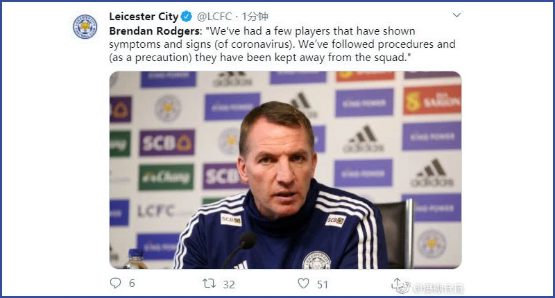电讯报并未透露该英超球队的名字,但罗杰斯在与沃特福德的赛前新闻发布会上对此进行了确认。他说:“我们队友有一些球员出现了感染新冠病毒的症状。我们已经遵循了相关程序来处理,为预防起见,让他们单独隔离。”