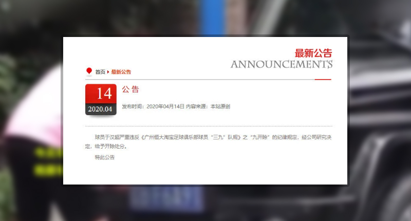 4月14日晚,广州恒大淘宝足球俱乐部发布公告,对严重违反“三九”队规的球员于汉超给予开除处分。